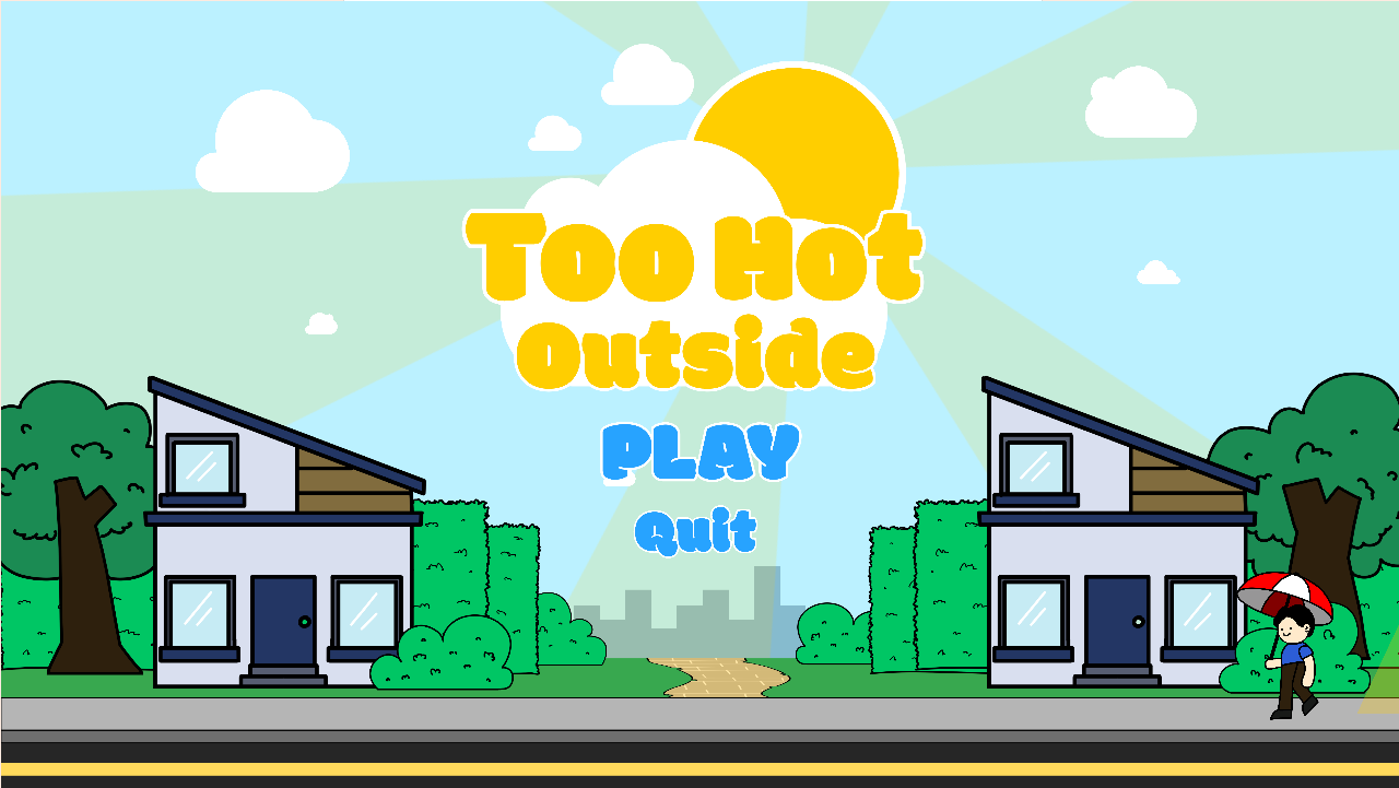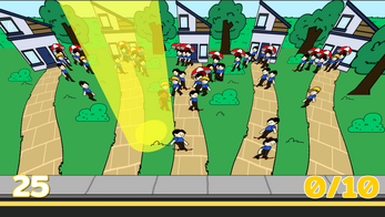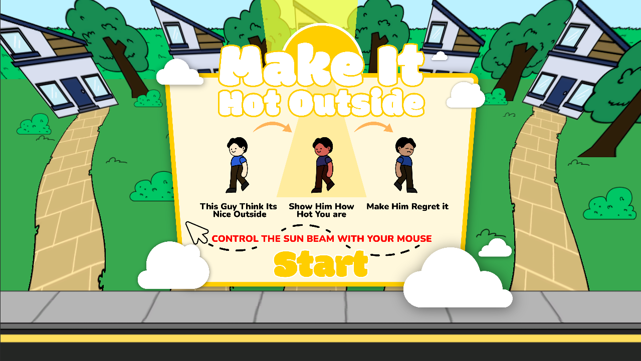 Too Hot Outside is a top-down tower defense game where YOU are the sun. Use your scorching sunbeam to stop pedestrian from leaving their houses. Drag your beam over enemies to drain their HP but don't worry, you're not killing anyone! Once burned enough, they'll retreat back inside like sensible people. Let too many escape to the road and it's game over. Survive the day, then spend the night upgrading your beam bigger, hotter, faster before the next wave of sun-avoiders tries to make a run for it. Can you keep everyone inside before summer ends?